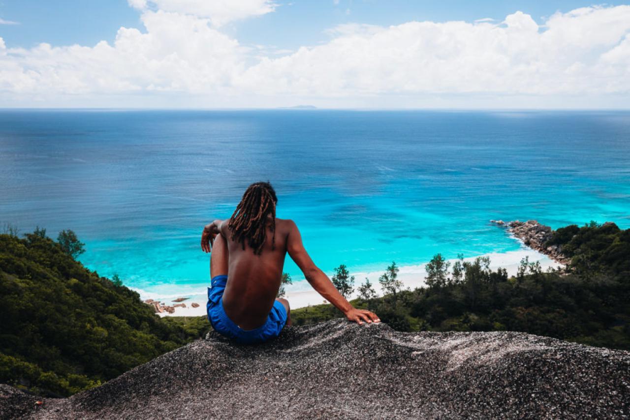 Embark on an exhilarating Full Day Hike to Nid d'Aigles & Anse Cocos, La Digue's highest peak offering breathtaking island panoramas. Trek down to the idyllic Anse Cocos beach with golden sands, palm trees, and a natural rock pool. Expert guides, safe transportation, and unforgettable scenery ensure an enriching and memorable adventure.