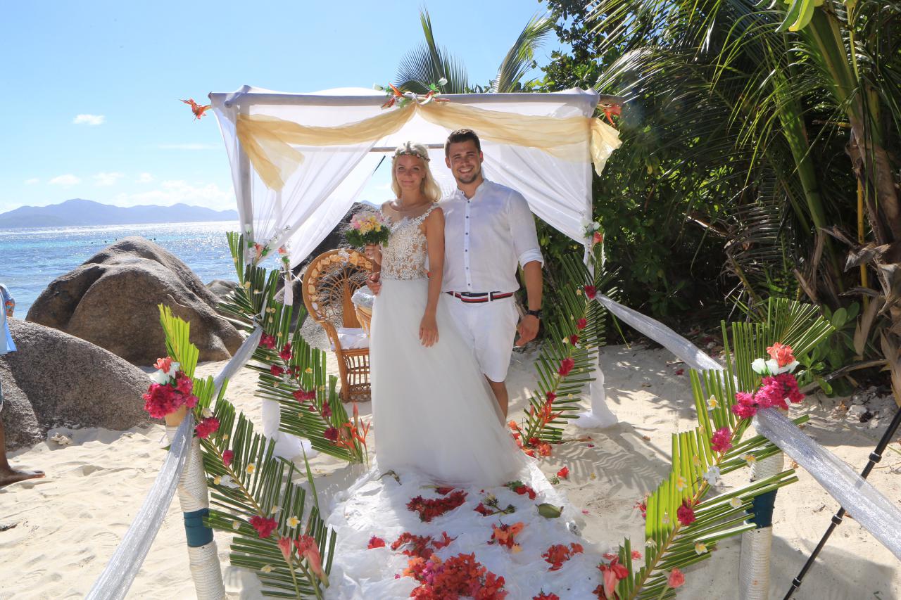 Exchange vows in paradise at Anse Source D'argent, Seychelles! Picture-perfect beach setting, creole flowers, legal recognition, all-inclusive package with cake, champagne, unique OxCart transport, and tropical elegance—start your forever in romantic bliss!